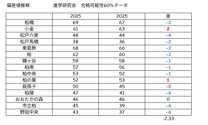 2015年と2025年の県立高校の偏差値推移を整理しました。